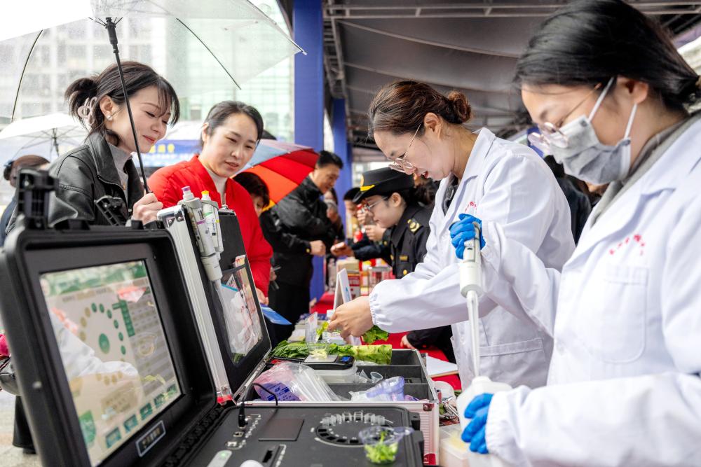 在浙江省湖州市长兴县放心消费嘉年华公益活动现场,该县食品药品检验检测中心工作人员为市民提供免费果蔬检测服务(2025年3月15日摄)。新华社发(谭云俸 摄)