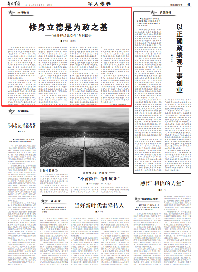 习主席高度重视党员干部修身立德问题,指出“以德修身、以德立威、以德服众,是干部成长成才的重要因素”“对党员干部来说,只有正心明道、怀德自重,才能在任何时候任何情况下都不放纵、不越轨、不逾矩”,强调党员干部“做人要有人品,当官要有官德”。当前,全军上下正凝心聚力攻坚建军百年,领导干部作为强军兴军中坚力量,为政一方、分领一域,既要凭能力素质立身立业,也要靠官德人品立信立威。只有做到正心明道、怀德自重,才能以过硬的作风形象取信官兵、感召官兵、引领官兵,带动广大官兵在强军征程上砥砺前行、创造佳绩。