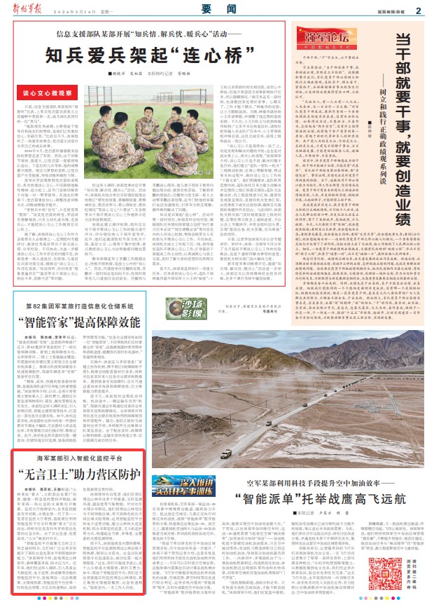 “智能监控平台就像无言的卫士和忠诚的哨兵,它们的广泛应用有效提升了部队应急处置水平和阵地防护能力。”该部领导介绍,驻地周边山林密布,森林覆盖率高、防火压力大。近年来,他们经过深入调研,引入具备全天候监控、电子巡更、热成像等功能的智能监控平台,驻地周边一旦出现烟雾、火情或热源,智能监控平台会第一时间发出预警,为官兵快速响应、高效处置赢得宝贵时间。