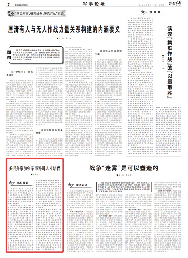 强军之道,要在得人。信息化智能化作战条件下,作战制胜观念、制胜要素和制胜方式等方面的重大变化,呼唤更多能力素质过硬的军事科研人才。为此,需要精准把握军事科研人才培育的内涵要求,多措并举加强高素质军事科研人才培养,从而在未来战场上赢得主动。