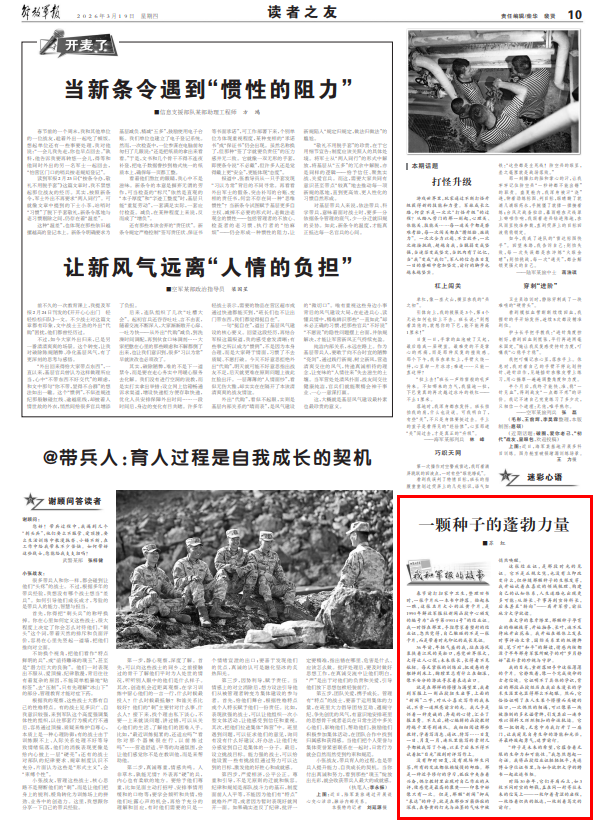 就是在那样的懵懂与渴望里,我看到军报上一则函授招生启事,上面的“新闻”二字,对从小喜欢写作的我来说,不啻一道照亮前方的光。我几乎是怀着一种虔诚的、奔赴的心情,汇去了报名费。不久后,精心编辑的函授教材跨越千里寄到连队。我细细阅读那些教材,学着写消息、通讯、特写……日复一日、月复一月,连队里能写的素材几乎都被我写了个遍,以至于后来不得不试着把“目光”投到时评写作上。