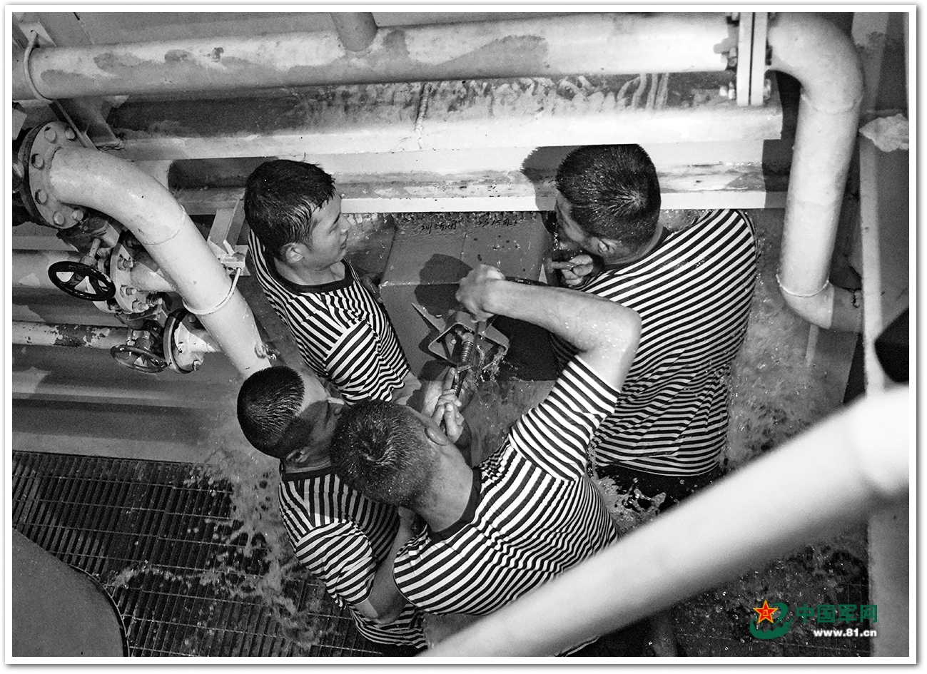 近日,海军某基地开展多科目训练。图为舱室破损堵漏训练场景。王 力摄