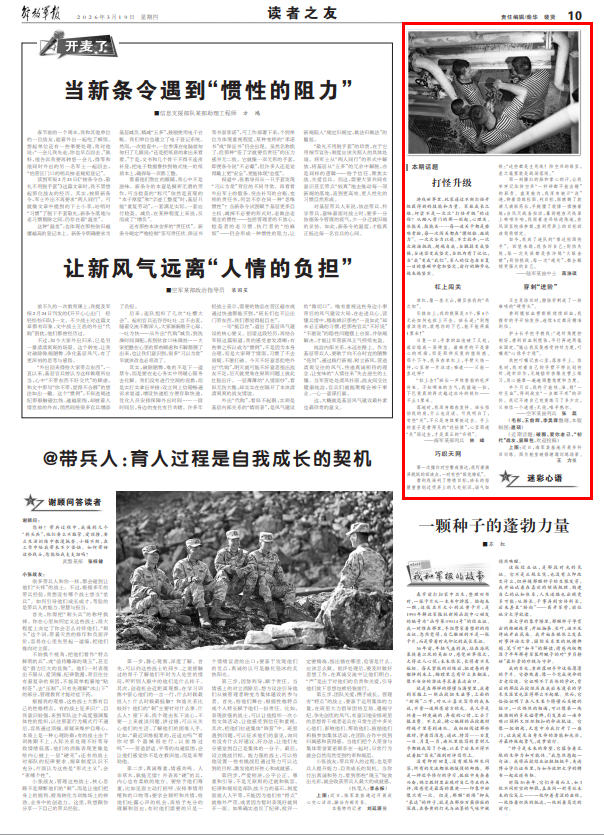 游戏世界里,玩家通过不断打怪升级获得新的技能和力量。军旅成长之路,何尝不是一次次“打怪升级”的过程?从踏入营门的那一刻起,心理关、体能关、技能关……每一道关卡都是磨难考验,每一次闯关都在“攒经验、涨战力”。一次次全力以赴、不言放弃,一次次迎接挑战、超越自我,当脆弱变成坚强,当迷茫变成坚定,当肌肉有了记忆,当“我”变成“我们”,军人的信念在日复一日的磨砺中愈加坚定,前行的脚步也越来越坚实。