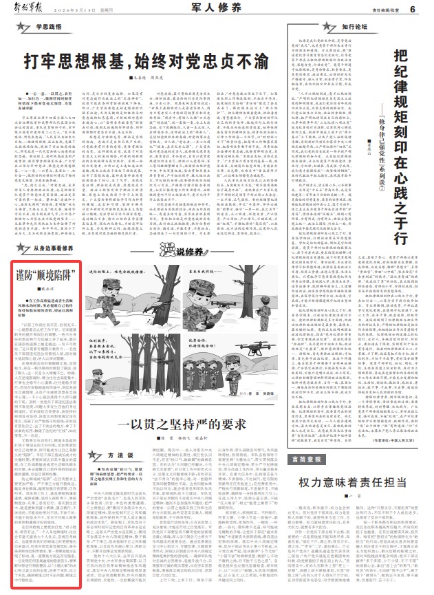 防止顺境成“陷阱”,在自我要求上要更加严格。严于律己方能行稳致远。越是身处顺境,越要加强自我管理、自我约束。具体到工作上,就是要做到谦虚谨慎、戒骄戒躁,坚持人按职责干、事按制度办,凡事三思而后行。落实到生活中,就是要做到谨小慎微、谨言慎行,不该说的、不能说的绝对不说,不该干的、不能干的坚决不干,牢牢守住做人做事的原则和遵规守纪的底线。