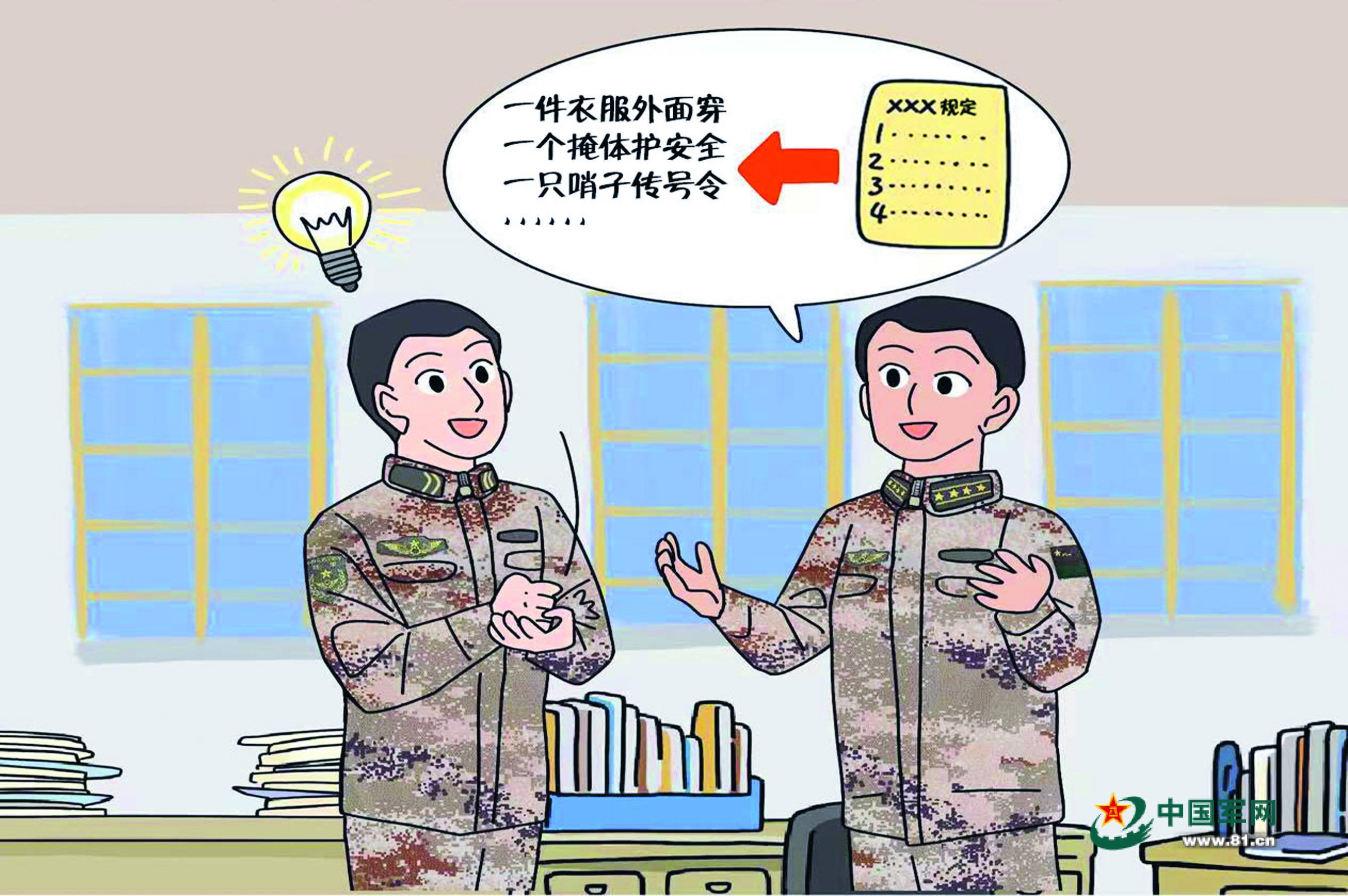 有人出言提醒:“部队各项工作都有相关规定和明确规范,如此简化是否妥当。”但韩旅长有着自己的考量:越重要的内容越应掌握,但基层官兵不可能逐字逐句背记所有规定,只有善于提炼总结、化繁为简,才能便于大家一看就懂、懂了能记住,促进全面掌握。“相比告诉战士‘规定里有’,直接告诉他们‘有些什么重点’更好。”韩旅长说。