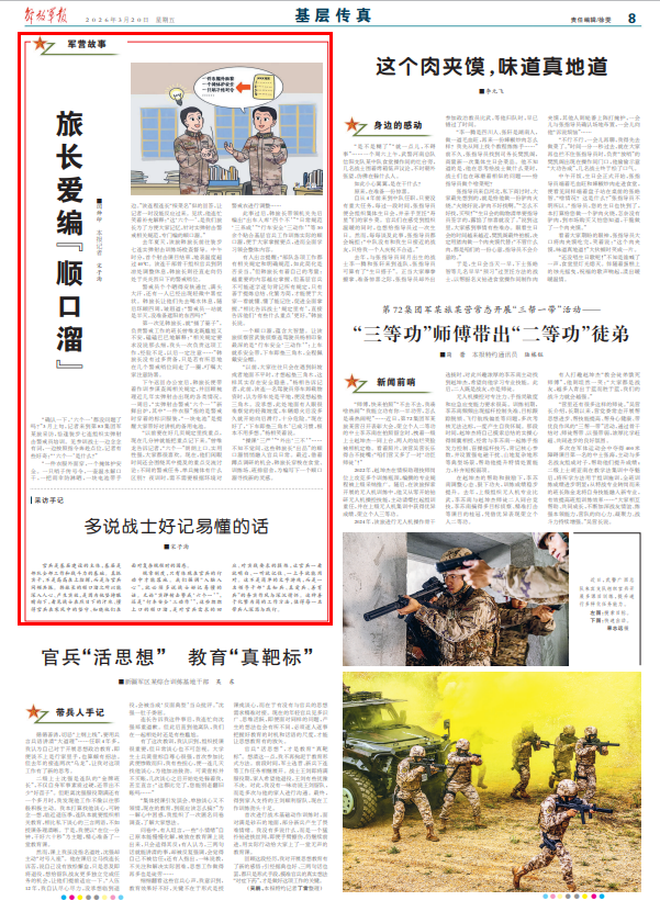 “操课‘三严’”“外出‘三不’”……不知不觉间,这些韩旅长“出品”的顺口溜悄悄融入官兵日常。最近,借着蹲点调研的机会,韩旅长穿梭在食堂、训练场、班排宿舍,为编写下一个顺口溜寻找新的灵感。