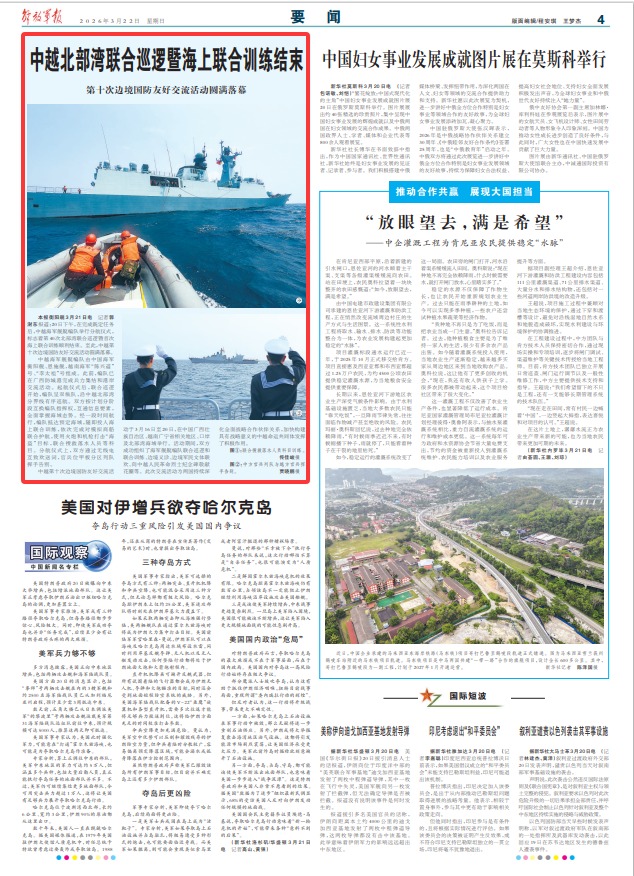 中越第十次边境国防友好交流活动于3月16日至20日,在中国广西壮族自治区、越南广宁省相关地区、口岸及北部湾海域举行。活动期间,双方成功组织了海军舰艇编队联合巡逻和联合训练、边境义诊、边境军民文体联欢、向中越人民革命烈士纪念碑敬献花圈等。此次交流活动为两国持续深化全面战略合作伙伴关系,加快构建具有战略意义的中越命运共同体发挥了积极作用。