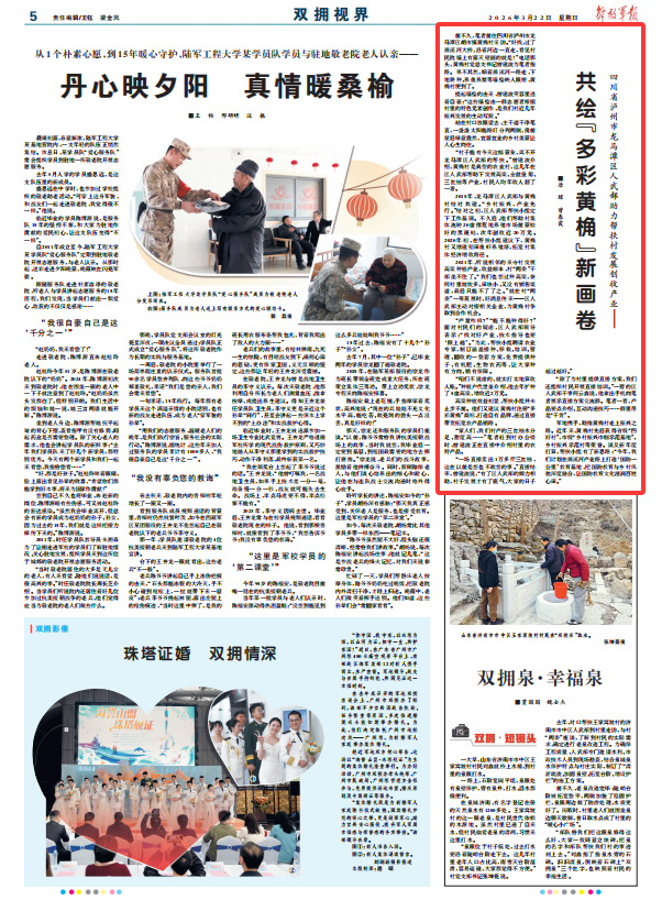 军地携手,助推黄桷村走上振兴之路。近年来,黄桷村先后获得省级“四好村”,市级“乡村振兴巾帼示范基地”、乡村振兴示范村等荣誉。谈及新年度打算,帮扶小组有了新思路:“今年,我们计划在濑溪河产业路上打造‘国防一公里’教育基地,把国防教育与乡村风貌深度融合,让国防教育文化浸润百姓心田。”