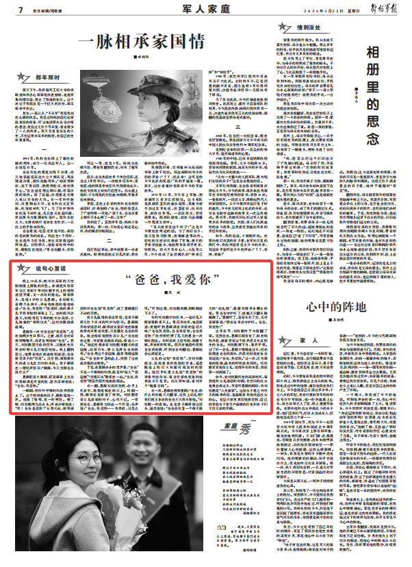 女儿的这句“我爱你”,对刘继鹏而言,是他繁重训练后的甘泉、巡逻险途上的灯火和面对孤寂时的慰藉。他把手机里女儿说“我爱你”的录像单独保存,每当想家或疲惫时就拿出来反复看。战友都知道,老刘有个“能量密码”。