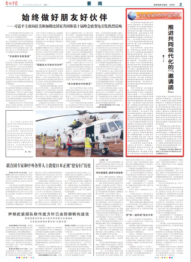 “世界动荡之际,中国引领未来”“真正致力于同世界实现互利共赢”“为动荡世界提供方向感”……国际社会的赞扬传递出一个清晰而强烈的共识:以自身发展为全球增长注入稳定动能,以大国担当为百年变局贡献稳定力量的中国,是机遇与未来,是“确定性绿洲”。在中国式现代化新征程上,中国将与世界各国共同书写更多互利共赢、相互成就的精彩故事,为人类发展进步作出新的更大贡献。