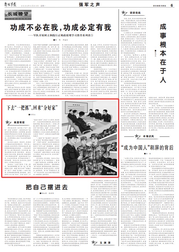 部队机关有一句行话:下去“一把抓”,回来“分好家”。意思是机关下基层要尽量统筹整合、全面掌握,把发现的情况带回机关归口反馈,再由各业务口及相关责任人具体挂钩帮建整改。这一朴素的提法,道出了机关指导基层的科学方法。