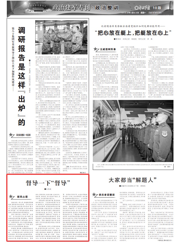 实践证明,督导越严格,落实的成效就越扎实。只有始终坚持严字当头、把好关口,对落实政治整训要求不力的及时帮带,对整肃治理力度不够的批评提醒,对政治责任心不强的倒逼问责,部队的学习教育、整肃治理才不会踩空走虚、流于形式。领导干部常怀“眼睛向下、脚步向下”的自觉,才能及时发现抓建中的薄弱环节,抓住矛盾根源,真正做到督在关键处、导在要害处。同时,要探索严在日常、抓在经常,引导形成高质量开展工作的常态和自觉。