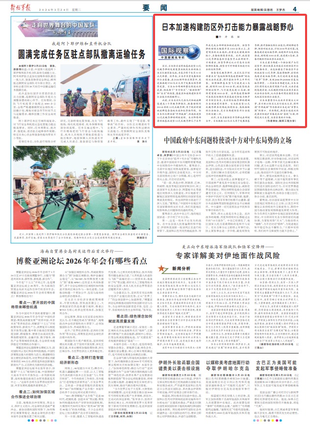 近日,日本防卫省将陆基改进型12式反舰导弹的发射装置运抵熊本县的陆上自卫队健军驻屯地,并表示将于本月31日正式部署。近年来,日本斥巨资发展防区外打击装备,在2026财年防卫预算中,更是拨款超9700亿日元用于发展远程导弹等武器。日本如今明确部署远程进攻性武器,彻底撕下“专守防卫”、“被动防御”和“自卫”的伪装,暴露其加速构建防区外打击能力的战略野心。