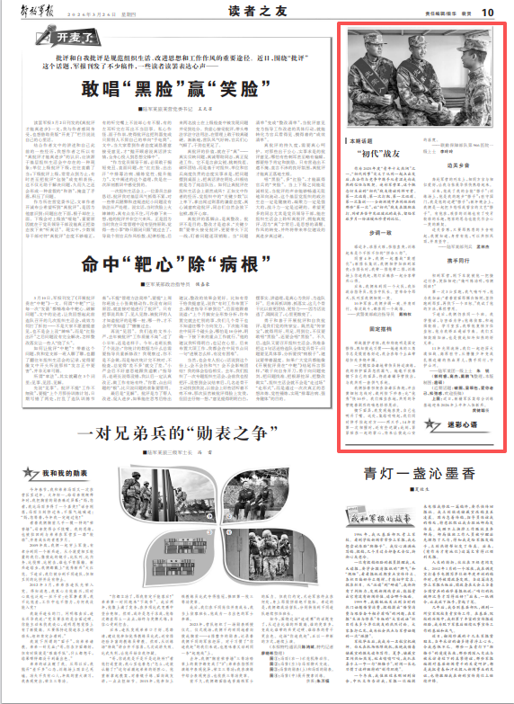后来,他成了我的全能“搭子”:训练场上,他是我的跑步“搭子”;驻守国门,我是他的巡逻“搭子”;新年晚会上,我俩是一起把乡愁唱成誓言的文艺“搭子”。有他在,艰苦的训练也有了咬牙较劲的乐趣,想家的思念也能化作会心一笑的默契。