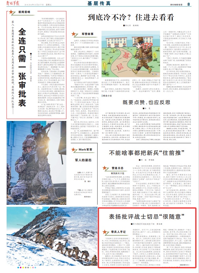 对于带兵人而言,讲评战士日常表现是一项常规工作,表扬批评一个战士没难度、很寻常,所以很容易脱口而出。但对于战士而言,带兵人的一句肯定,或许能激励前进,一次错误的批评,也很可能造成不小的打击。所以,不论表扬还是批评,开口之前,一定要了解清楚事情的来龙去脉,避免因随意而出错,从而打消战士积极性。