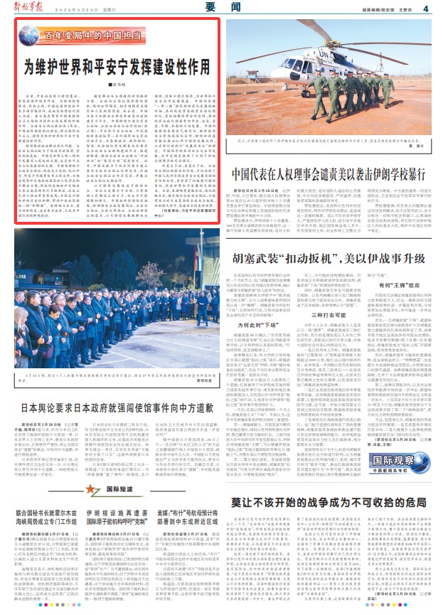 当前,中东地区战火持续蔓延,紧张局势升级并外溢。为推动局势降温、促和止战,中国派遣特使赴中东多国穿梭访问,就地区局势进行深入沟通。各方高度赞赏中国秉持的公正立场和为促和止战发挥的积极作用。全球安全倡议提出近4年来,中国始终秉持倡议理念,捍卫国际公平正义,持续为维护世界和平安宁发挥建设性作用。