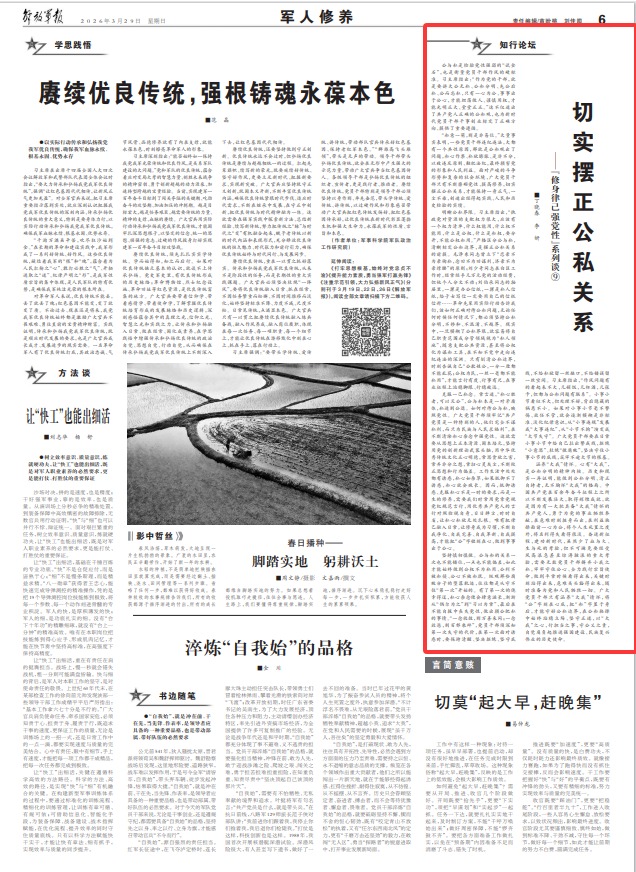 明晰公私界限。习主席指出,“执政党对资源的支配权力很大,应该有一个权力清单,什么权能用,什么权不能用,什么是公权,什么是私权,要分开,不能公权私用。”严格区分公与私,清晰标定公私边界,是摆正公私关系的前提。毛泽东同志曾立下“恋亲不为亲徇私,念旧不为旧谋利,济亲不为亲撑腰”的原则;刘少奇同志在白区工作时,经常经手几万元党的活动经费,但他个人分文不动;刘伯承同志的抽屉里,一摞是办公信纸,一摞是私人信纸,给子女写信一定要用自己的信纸信封……革命先辈用实际行动告诉我们,该如何正确对待公私问题,无论任何时候任何情况下,都必须坚持公私分明,不掺和、不混淆、不越界。现实中,一旦模糊了公私界限,就容易将自己职责范围或分管领域视为“私人领地”,随意支配公共资源,甚至将公权化为谋私工具,在不知不觉中走向违纪违法的深渊。只有划清公私边界,时刻告诫自己“公款姓公,一分一厘都不能乱花;公权为民,一丝一毫都不能私用”,才能言行有度、行事有尺,在事业征程上站稳脚跟、行稳致远。