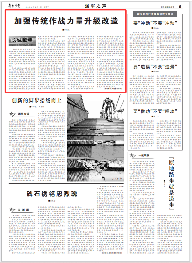 传统作战力量的升级改造,连接着历史的胜战基因,承载着今天的备战使命,更指向未来的打赢能力。我们要坚定信心、保持定力,坚持以机械化为基础、信息化为主导、智能化为方向,嵌入先进技术,优化结构编成,创新作战运用,真正把传统作战力量改强、改精、改到位,让老装备焕发新活力、老部队展现新作为。要坚持以战领建、以训促改,战训一致、体系练兵,在备战中检验改造成效,在斗争中优化改造方向,形成战、建、备相互促进的良性循环,把升级改造成果转化为实打实的战斗力,锻造出无坚不摧、战无不胜的精兵劲旅。