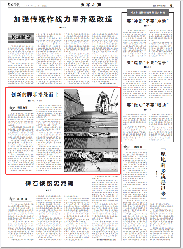 时代的列车一往无前,创新的脚步拾级而上。对一个历经风雨而矢志复兴的国家来说,对一支建军百年而向新图强的军队来讲,创新从不是锦上添花,而是生死抉择。全面实施科技强军战略,加快实现高水平科技自立自强,背水一战、久久为功,敢闯敢试、愈挫愈勇,方能突出重围、勇立潮头。