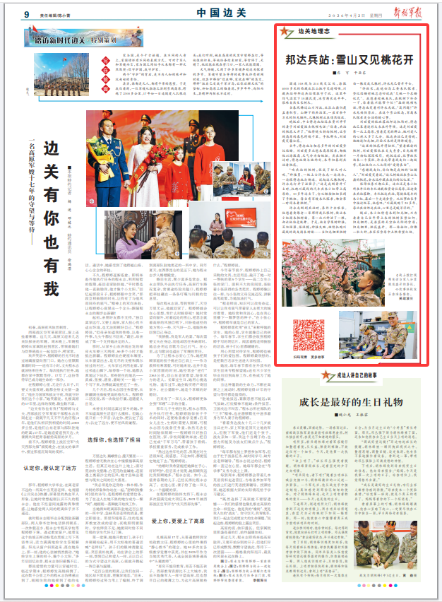 晚饭后,中士傅忠池给远在贵州毕节的妻子刘丽霞拨去视频电话:“你看,兵站的桃花又开了。”他将镜头转向桃树,让雪域高原的春色跨越千里。手机那头,刘丽霞笑靥如花。