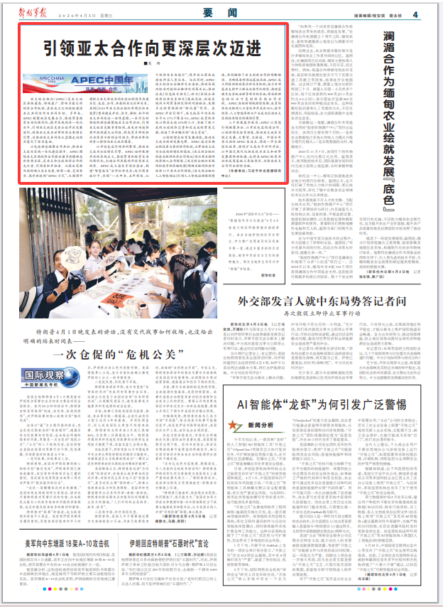三十余载春华秋实,APEC以思想引领凝聚共识、以开放包容促进合作、以创新增长培育动能,推动亚太地区实现大发展、大繁荣、大融通。中国今年再次担任APEC东道主,将进一步全面深化改革,持续扩大高水平对外开放,以中国式现代化新成就为亚太和世界发展提供新机遇,也将在APEC既有共识和成果基础上再接再厉,为推进亚太合作作出新的贡献。