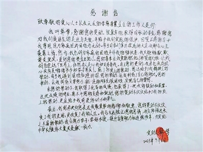 被资助学生写给张景杰的感谢信。受访者供图