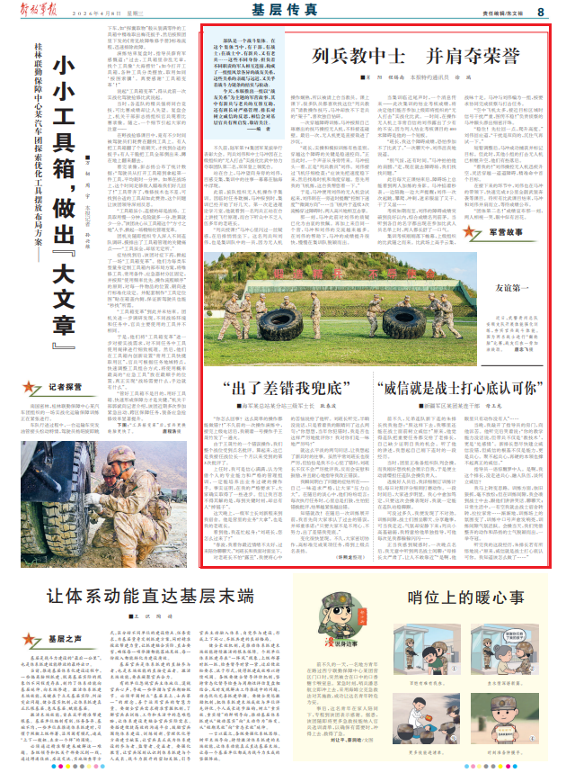我马上转变思路。训练方面,依旧狠抓,毫不放松;但在训练间隙,我会凑到战士中去,跟他们讲讲笑话、聊聊天;日常生活中,一有空我就去战士宿舍转转,拉拉家常……渐渐地,训练场上的氛围变了,训练中口号声愈发响亮,训练间隙气氛活跃。会操当天,我们凭借整齐的动作和昂扬的士气脱颖而出,一举夺冠。