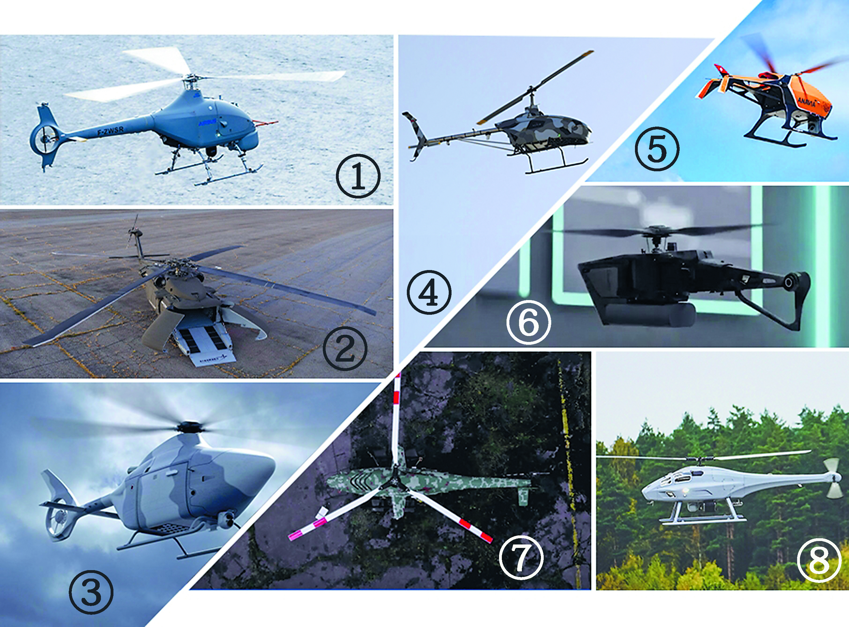 图①:VSR700无人机;图②:S-70 UAS“黑鹰”无人直升机;图③:Proteus无人直升机(渲染图);图④:Alpin无人直升机;图⑤:HT-100无人直升机;图⑥:Nanoalp微型无人机;图⑦:“猎人”侦察和攻击无人直升机;图⑧:Skeldar V-200无人直升机。
