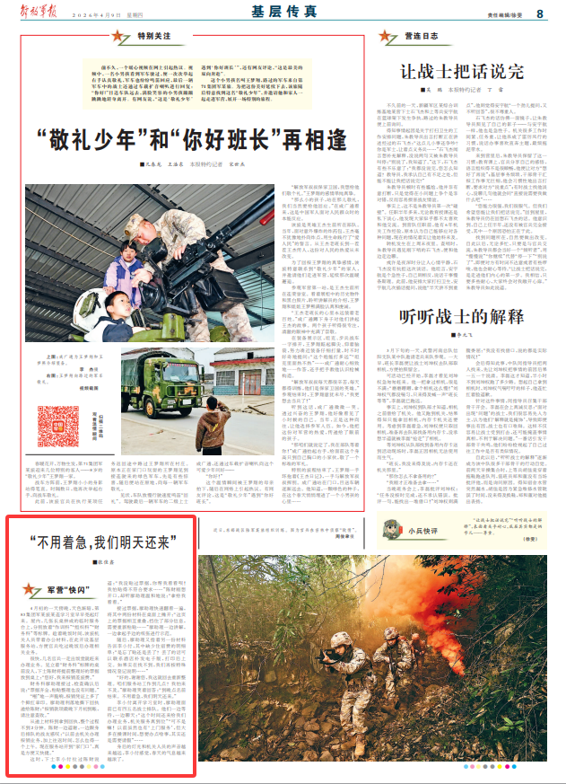 李小付离开学习室时,廖助理面前已有四五名战士排队。他们一边等待,一边聊天:“这个时间还来给我们办理业务,机关服务真到位”“可不是嘛!以前虽然也有‘上门服务’,但大多在操课时间,想要办点啥事,其实还是需要请假”……