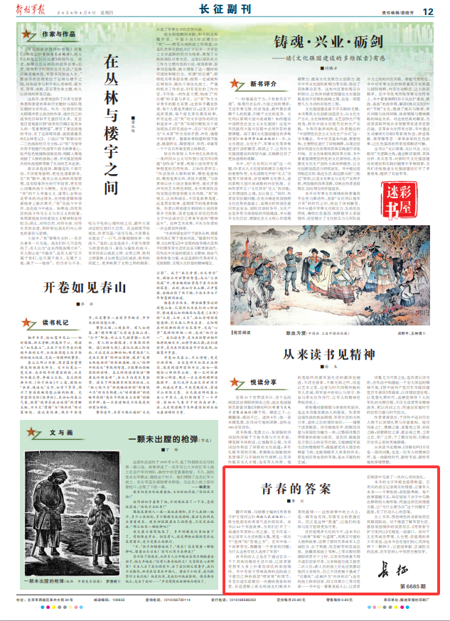 合上书页,那些绿色的身影依然在我眼前跃动。对于渴望了解军营生活、感悟家国情怀的读者而言,《用青春守护万里河山》无疑是一扇窗口。而对于正在形成世界观、人生观、价值观的青少年来说,这本书会在他们的心灵深处种下一颗种子,让爱国奉献、忠诚担当的品质,在年轻的心中悄然生根发芽。