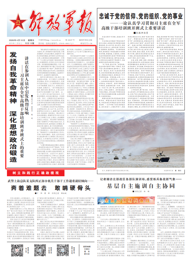 “要以新时代中国特色社会主义思想为指导,深入贯彻新时代强军思想,开展思想整风,深化政治整训,加强我军干部队伍革命性锻造,始终保持人民军队纯洁光荣,以崭新政治面貌迎接建军一百周年。”习主席在全军高级干部培训班开班式上的重要讲话,在参训人员中引发热烈反响。深切感悟统帅嘱托期许,大家一致表示,要深刻领悟“两个确立”的决定性意义,坚决做到“两个维护”,贯彻军委主席负责制,积极改进学风训风,发扬彻底的自我革命精神接受淬炼锻造,立起领导干部好样子,奋进强军打赢新征程。