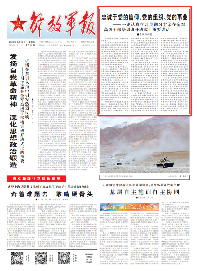 习主席在全军高级干部培训班开班式上指出,我党我军是用理想信念凝聚起来的,加入这个党、这支军队,就要笃信马克思主义,就要忠诚于党的信仰、党的组织、党的事业。习主席的重要讲话,深刻阐述了对党忠诚的方向性根本性问题,思想深邃、立意深远,必将极大感召和激励军队各级干部特别是高级干部坚定理想信念、铸牢政治忠诚,以实际行动立起领导干部好样子,为奋进强军打赢作出新的更大贡献。
