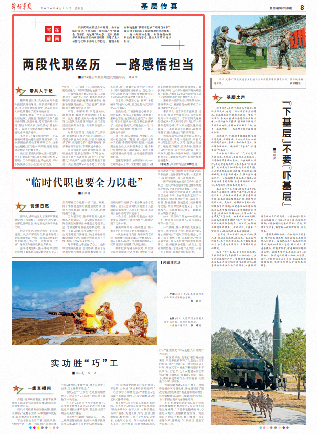 我代职的第一个连队基础扎实、队伍过硬。到任后,我坚持“五同”,把训练间隙、饭后休息、熄灯前的碎片时间,都当作听兵声、知兵情的“黄金时段”。各项工作推进得比较顺畅,连队建设水平稳步提升。