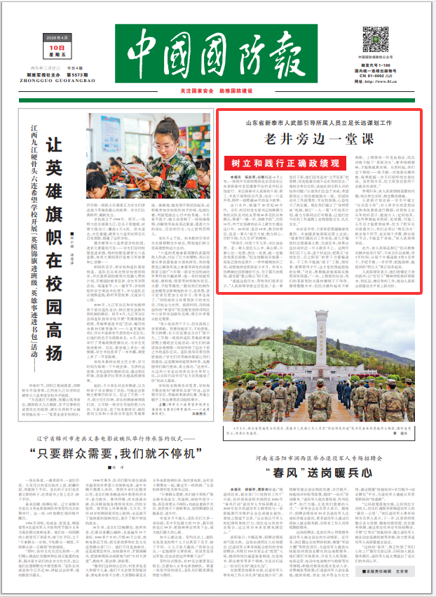 中国国防报讯 伍炎军、公勋报道:4月上旬,一场别开生面的现场见学活动在山东省新泰市龙廷镇掌平洼村老井纪念馆进行。来自新泰市人武部的干部、职工、专武干部和民兵代表,站在一口老井旁,聆听一段跨越60年的奋斗故事。