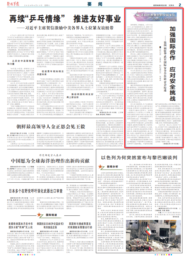 春和景明,万物勃发。4月9日至10日,由中国国防部主办、国防大学国际防务学院承办的第四届驻华武官国际安全合作研讨会在京举行。80多个国家的驻华武官和部分国际组织驻华代表齐聚一堂,围绕国际战略形势深入研讨,聚焦加强国际合作应对安全挑战议题对话交流、凝聚共识。