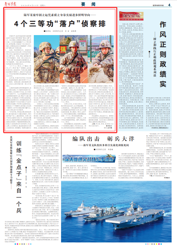 “3个个人三等功、1个集体三等功,4个三等功‘落户’侦察排,这在连队的历史上还是首次。”白培文说,随着政治整训不断深入,部队风气愈发纯正,“评功评奖用事实和成绩说话”成为官兵共识。