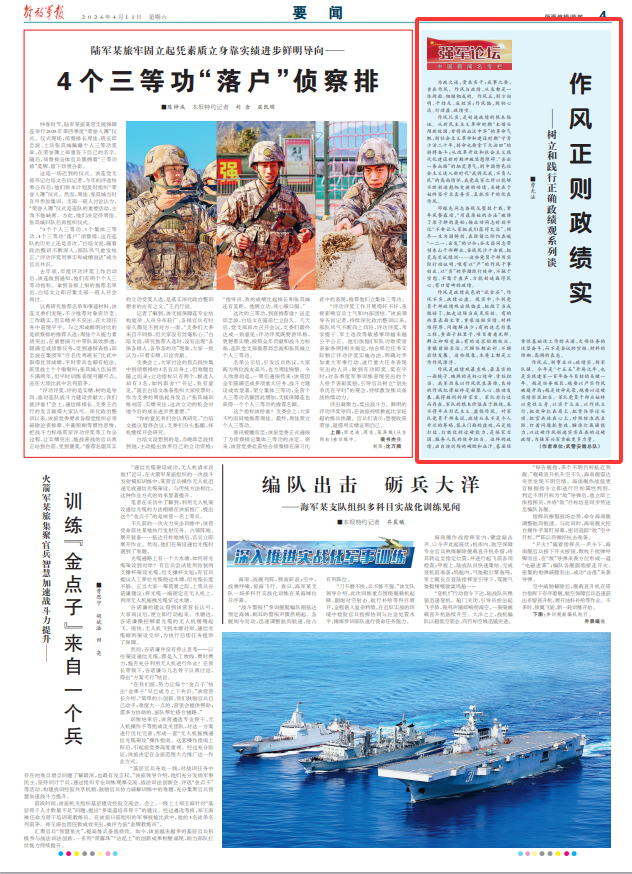 作风正,则事业兴;政绩实,则军队强。今年是“十五五”开局之年,也是实现建军一百年奋斗目标的关键一年。越是任务艰巨,越要以严实作风破题开局;越是使命光荣,越要以过硬实绩彰显担当。军队党员干部应始终以党性立身、以实干立业、以作风立行,把使命扛在肩上、把责任举过头顶、把官兵放在心上,对照标准找差距、盯着问题抓整改、瞄准打赢强能力,以过硬作风创造实实在在的过硬政绩,为强军兴军贡献更多力量。