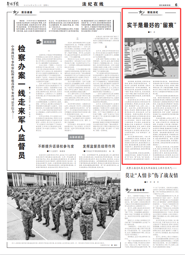 痕迹是工作的记录,不是政绩的全部;规范是管理的底线,不是折腾的理由。我们要以树立和践行正确政绩观为牵引,落实依法治军要求,坚决摆脱痕迹主义的束缚,真正让实干成为最好留痕,让战斗力提升成为最大政绩。