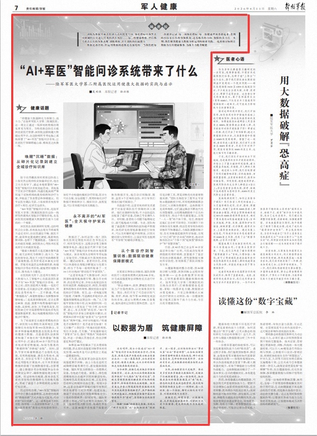 “AI+军医”智能问诊系统,是陆军军医大学第二附属医院面向边防一线研发的离线式智能诊疗辅助系统,也是该医院挖掘健康大数据背后战斗力密码的一个缩影。
