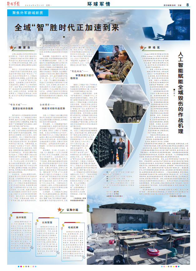 事实上,无论是在俄乌冲突中人工智能对作战行动的持续渗透,还是美国对委内瑞拉发起“绝对决心”行动以及此次伊朗战事中人工智能对全域毁伤的体系赋能,这些军事实践无不昭示,一个全域“智”胜时代正加速到来。这场帷幕已启的军事变革,正把战争核心逻辑从“人主导的线性杀伤”,变成“算法主导的网状闭环杀伤”,推动战争形态加速向智能化、精准化、全域化方向迈进。如何最大限度释放人工智能在全域作战上的效能,成为当今世界各军事强国的关注焦点。
