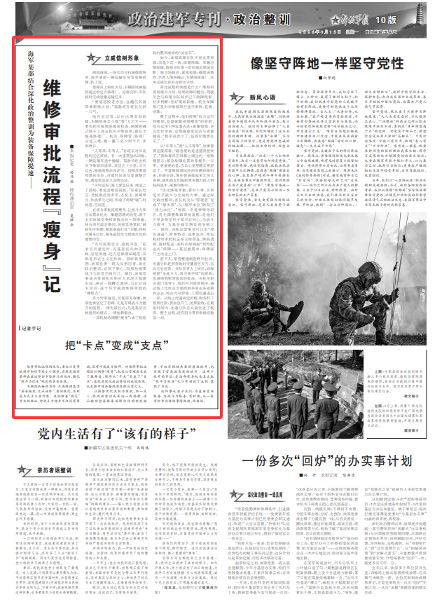 不顾练兵备战实际,片面强调落实“层层报批、定点送修”,看似规范,实则是形式主义在作祟。这些披着“规范”外衣的做法,对战斗力增长不仅没有帮助,还有可能成为阻碍。对维修审批流程进行调整“瘦身”,机关从管理者变成了服务者,程序从“卡点”变成了“支点”,这既是深化政治整训的成效体现,也是提升练兵备战质效的应有之义。