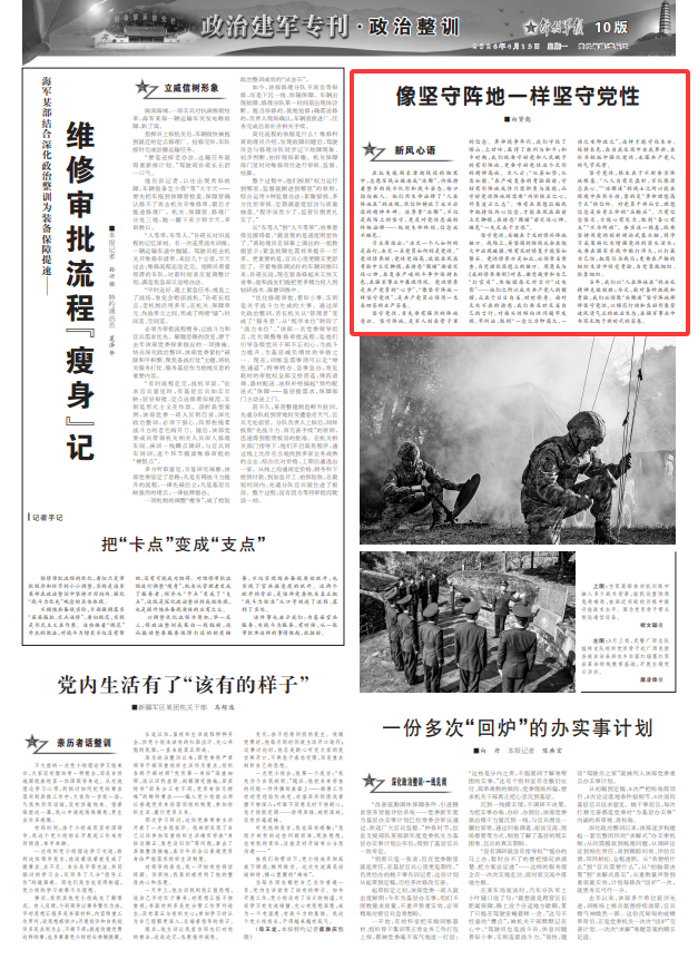 坚守党性,首先要有强烈的阵地意识。坚守阵地,是军人刻在骨子里的信念。革命战争年代,我们守住了塔山、上甘岭,赢得了胜利与和平;和平时期,我们既要守好党和人民赋予的有形阵地,更要守好党性这个无形的精神高地。古人云:“从善如登,从恶如崩。”在严峻复杂的考验面前,守好有形阵地或许只需职责与技能,而守好党性阵地则需要“内怀铁石之心,外负凌云之志”。唯有在思想拉锯战中把持住内心信念,才能在风浪面前立定脚跟,在诱惑“围猎”前定住心神,避免“一失足成千古恨”。