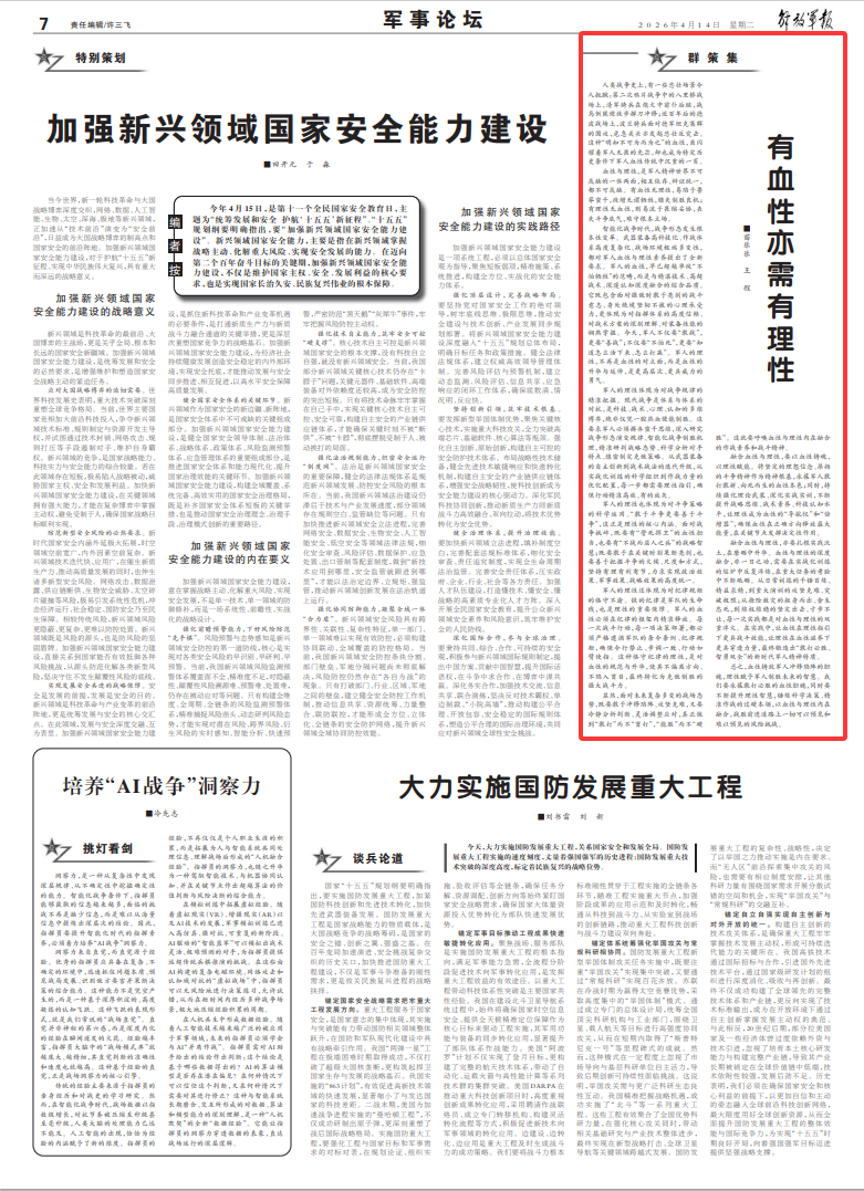 显然,面对未来复杂多变的战场态势,既要敢于冲锋陷阵、攻坚克难,又要冷静分析判断、灵活调整应对,真正做到“敢打”而不“盲打”,“能胜”而不“硬胜”。这就要呼唤血性与理性内在融合的作战素养和战斗精神。