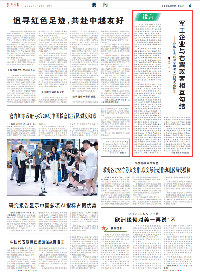 这种军工企业与右翼势力相互利用、深度裹挟的模式,不仅加剧国家财政危机与社会民生困局,更将导致日本政坛进一步右倾化,历史修正主义思潮愈加泛滥,不断消解战后日本的和平根基。背着尚未清算的侵略罪责,日本却放纵军工利益集团发展进攻性武器装备,谋求“再军事化”,这是对地区和平稳定的严重威胁。国际社会必须高度警惕,坚决抵制日本“新型军国主义”的任何妄动。