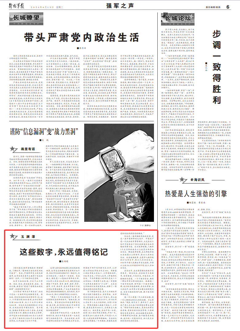 在长征中,永远值得铭记的数字还有很多。因为长征,这些数字不再简单,回首凝望,可见历史,可感悲壮,可探牺牲与崇高。一个个数字背后,都有一群红军将士鲜活的面孔。抚摸每一个数字的纹理、倾听每一个数字的脉搏,我们依然能感悟到,在生死考验、血火洗礼中,红军将士坚如磐石的理想信念、百折不挠的英雄气概、敢于胜利的革命风范。