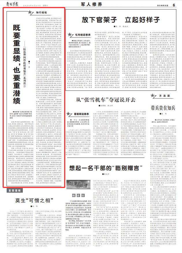 显绩,立竿见影、可感可知,回应当下之需;潜绩,埋头深耕、久久为功,奠基长远之业。二者共同构成干事创业的完整图景。然而现实中,一些党员干部的政绩观存在偏差,重显绩、轻潜绩的问题相对突出。有的急功近利,上级重视什么就干什么,任期内什么见效快就抓什么,而对一些基础性、长期性工作不够重视;有的好大喜功,为追求显性成绩,盲目铺摊子、上项目,频繁“换赛道”“翻烧饼”,透支单位发展潜力、消耗过往发展积累;还有的拈轻怕重,对解决历史遗留问题、消除苗头隐患等潜绩不重视、不愿抓,片面认为“费力不讨好”,只想着抓一些易出彩、见效快的事,等等。这些错误做法,影响的是党员干部的形象威信,侵蚀的是党和军队事业的发展根基。