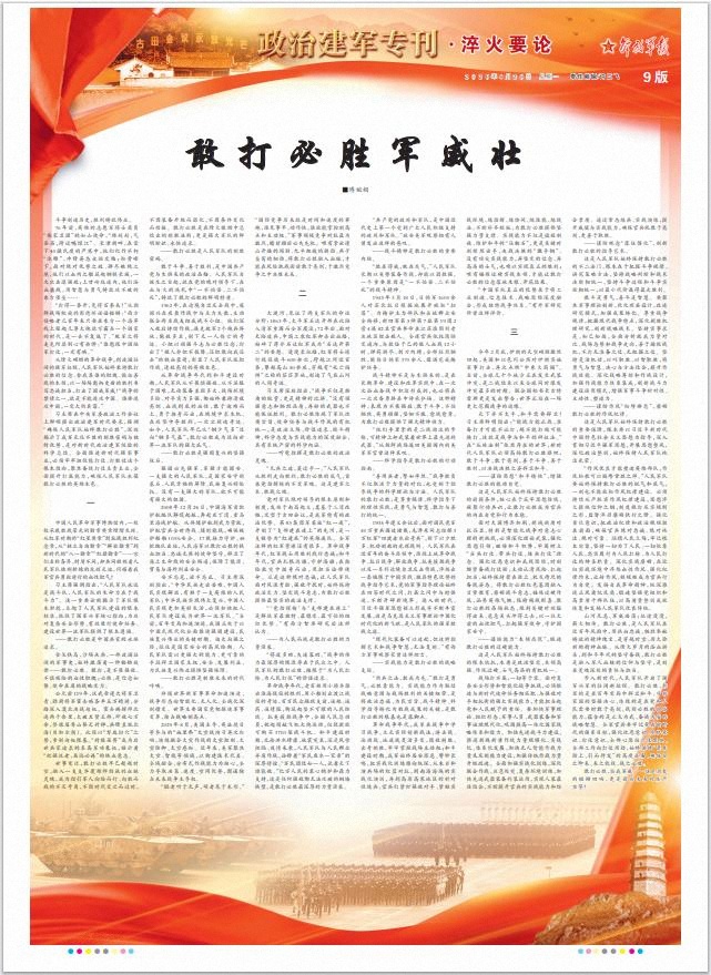 山河无恙,军威浩荡;征途漫漫,薪火相传。敢打必胜,是人民军队在近百年风雨中,用热血忠诚、牺牲奉献铸就的精神瑰宝,是穿越时空、历久弥新的精神血脉。从烽火岁月的浴血拼杀,到和平年代的坚守备战,敢打必胜是融入军人血脉的信仰与坚守,是刻在灵魂深处的责任与担当。
