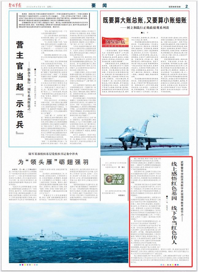 线上感悟红色基因,线下争当红色传人。近期,该院依托数字史馆广泛开展各类专题教育活动,引导全体学员在学习红色历史中砥砺初心使命,在重温先辈事迹中汲取奋进力量,切实将学习教育激发的热情动力转化为练兵备战、精武强能的实际行动。