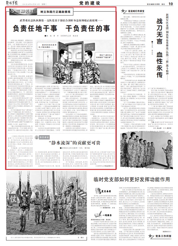 很快,变化悄然发生。中队党建活动室“党员先锋榜”上,动态更新党员日常表现,并将考评结果与评优评先、立功受奖等挂钩;《攻坚任务进度表》中,清晰标注党员骨干牵头负责攻坚的具体任务、详细举措和完成时限;增设谈心角、复盘区,让每一处设计都贴合官兵需求、服务备战打仗……