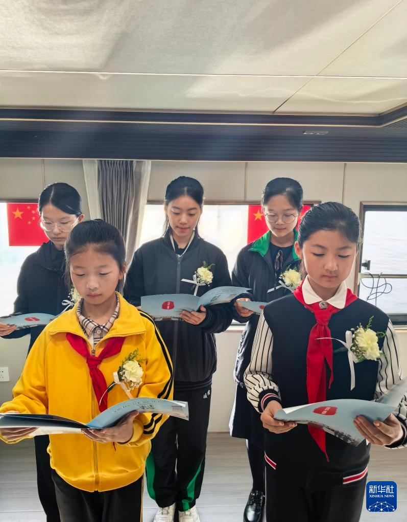 4月21日,青少年代表在船上齐声朗诵。新华社记者 于力 摄